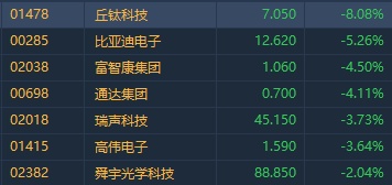 智通财经APP获悉,手机设备股早盘悉数走低,截至发稿,丘钛科技(01478)跌8.08%,富智康集团(02038)跌4.5%,通达集团(00698)跌4.11%,高伟电子(01415)跌3.64%。