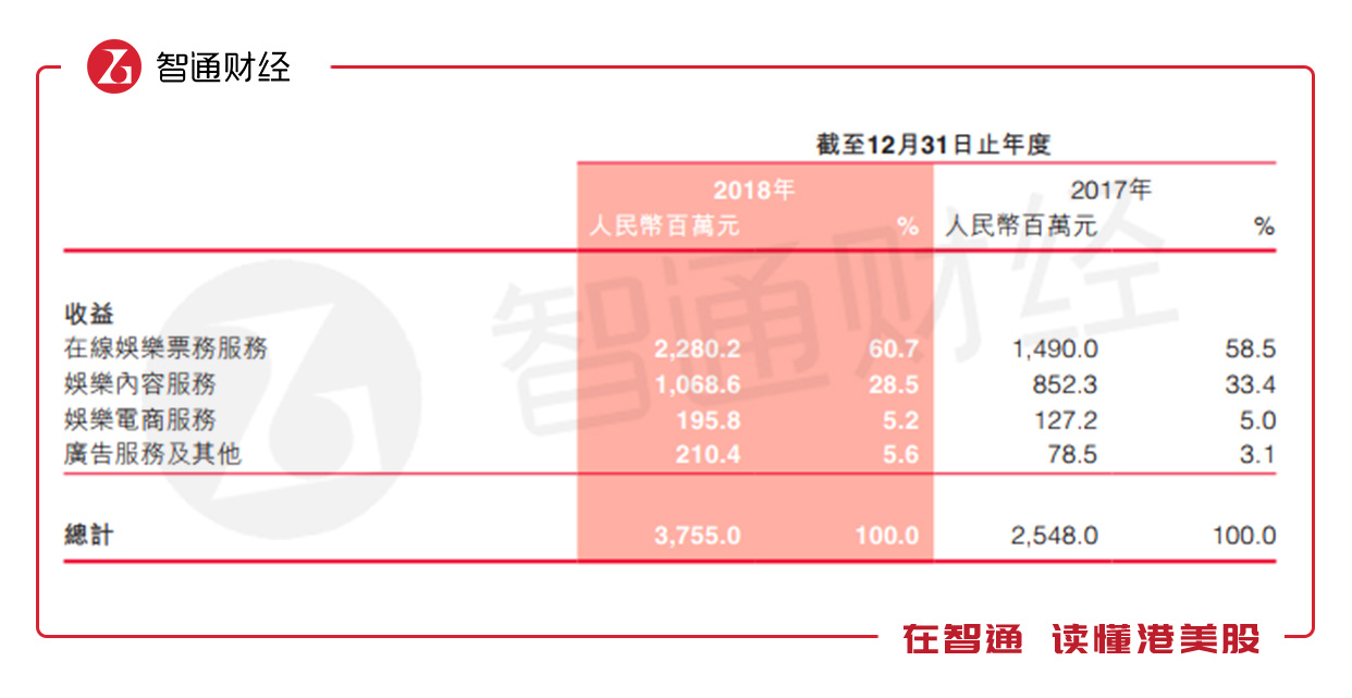 2018年猫眼的在线娱乐票务服务收入22.8亿元,收入占比60.7%,近三年收入复合增长率达到54.1%。