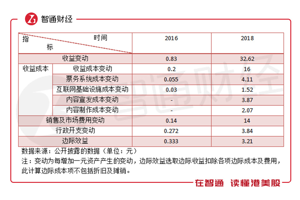 由于资本的扩张导致各项成本及费用的扩张,从2016-2018年区间看,猫眼的各项边际指标都在增长,但是边际收益项增长的速度要快于成本及费用项,反映出边际费用指标改善,从而使得边际效益得到显著改善。2018年猫眼的边际效益为3.21元,远比2016及2017年高出很多。