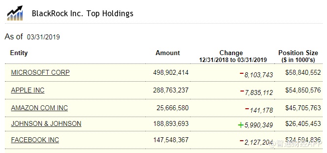 截至3月31日,贝莱德除了小幅增持强生外,对其他四支股票均进行了减仓,其中对微软减持了810万股,但以市值计算,微软仍为其第一大重仓。