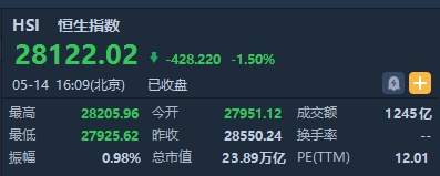 截至收盘,恒生指数跌428.22点或1.5%,报28122.02点,全日成交额达1245.37亿。国企指数跌1.53%,报10764.02点,红筹指数跌1.79%,报4350.06点。