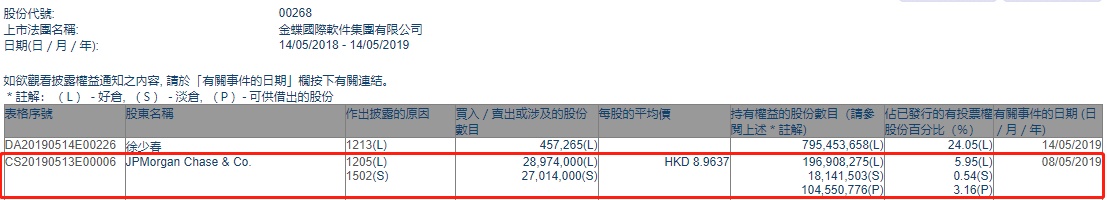 智通财经APP获悉,根据联交所资料显示,摩根大通于5月8日减持金蝶国际(00268)2897万股,每股作价8.96港元,总值约2.60亿港元,最新持股数目约1.97亿股,最新持股比例为5.95%。