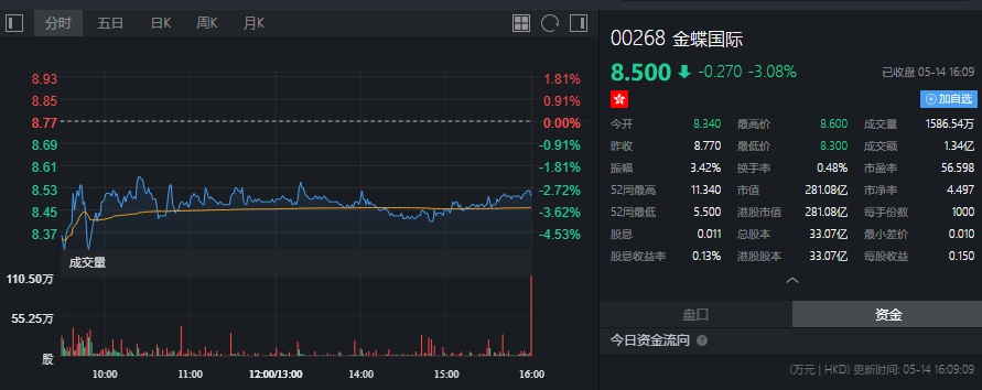 截至今日收盘,金蝶国际(00268)跌3.08%,报8.5港元。