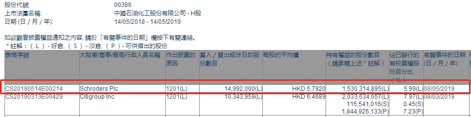 智通财经APP获悉,根据联交所资料显示,施罗德于5月8日减持中国石油化工(00386)1499万股,每股作价5.79港元,总值约8679.21万港元,最新持股数目约1.53亿股,最新持股比例为5.99%。