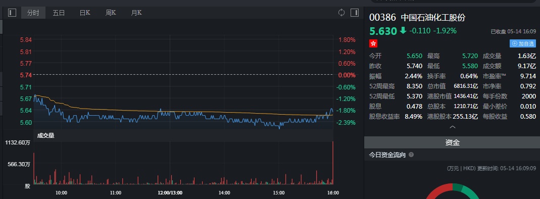 截至今日收盘,中国石油化工(00386)跌1.92%,报5.63港元。