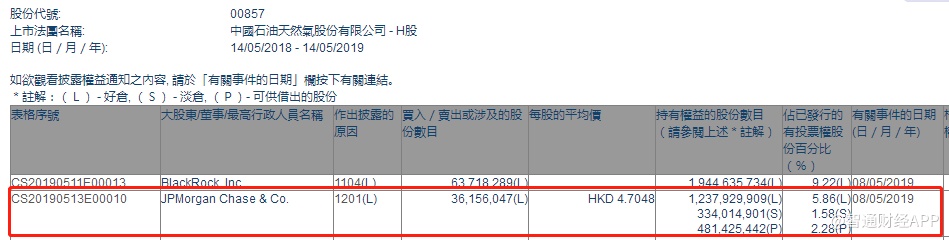 智通财经APP获悉,根据联交所资料显示,摩根大通于5月8日减持中国石油股份(00857)3615.6万股,每股作价4.70港元,总值约1.70亿港元,最新持股数目约12.38亿股,最新持股比例为5.86%。