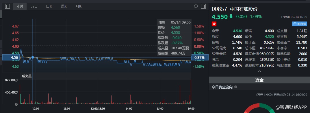 截至今日收盘,中国石油股份(00857)跌1.09%,报4.55港元。