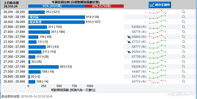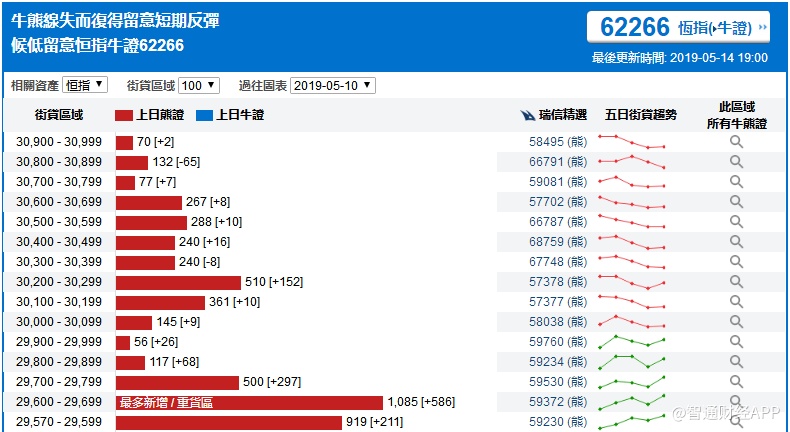 智通财经APP获悉,截至5月14日,恒指最新的牛熊街货比例60:40。从瑞信恒指牛熊证街货分布图中得到的数据显示,熊证街货重货区在29600-29699区间,该区间最新熊证数量为1085张,较上一交易日增加586张,最多新增区间在同一区间。牛证街货重货区在28100-28199区间,该区间最新牛证数量为919张,比上一交易日增加39张,最多新增区间在28000-28099区间。