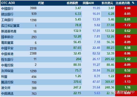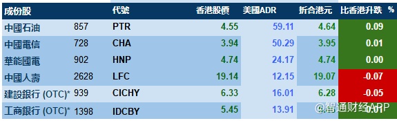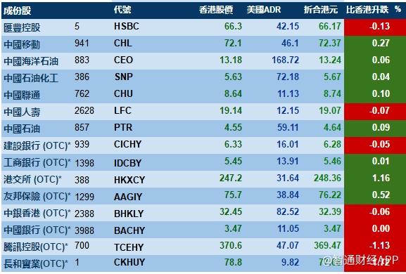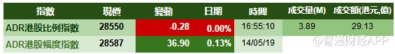 智通财经APP获悉,港股ADR指数全日走势平稳,按比例计算,收报28550点,跌0.28点。大型蓝筹疲弱,汇丰控股收报66.17元,较港收市跌0.13元;腾讯控股收报369.47元,较港收市跌1.13元。