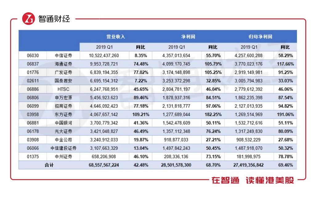 智通财经APP此前也对沪港深基金一季度净值涨幅做过一项统计,结果显示,一季度重仓金融股尤其是券商股的基金在当季获得了亮眼的增幅表现。截至目前,港股证券经纪板块中共有13家主板上市企业发布了一季度业绩报告。而从现已公布业绩券商的数据来看,表现十分亮眼。