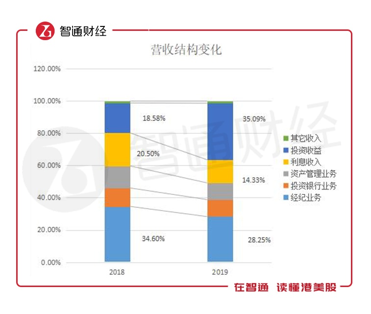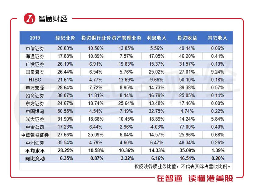 从各业务板块收入结构变动来看,智通财经APP在下表中对下列各项业务之间的占比做出了一项统计。其中,投资收益无疑首当其冲成为占比最大的板块,平均占比达35%。中金公司(03908)的投资收益占比更是高达了77%。