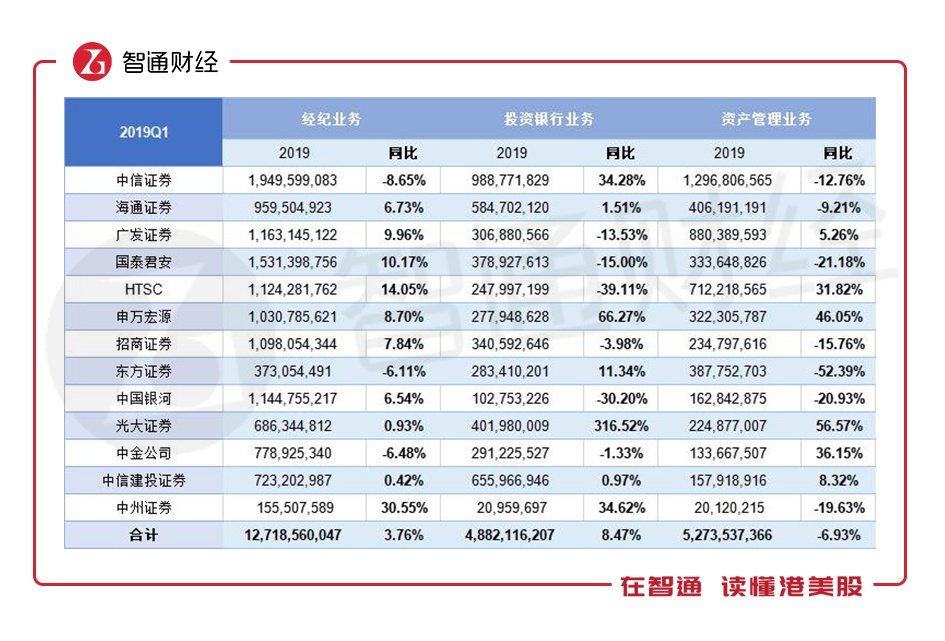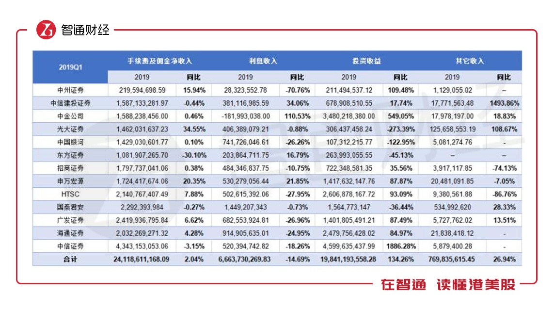 从上各业务收入成长情况也能够看出,营收盘排名靠前的券商,投资收益增长速度也走在行业水平之前。其中,营收排名第一的中信证券(06030)在2019年一季度实现了高达1886.28%的投资收益同比增长,赚钱效应明显。