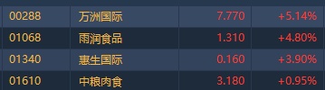 智通财经APP获悉,猪肉股早盘集体回暖,截至发稿,万洲国际(00288)涨5.14%,雨润食品(01068)涨4.8%,惠生国际(01340)涨3.9%,中粮肉食(01610)涨0.95%。