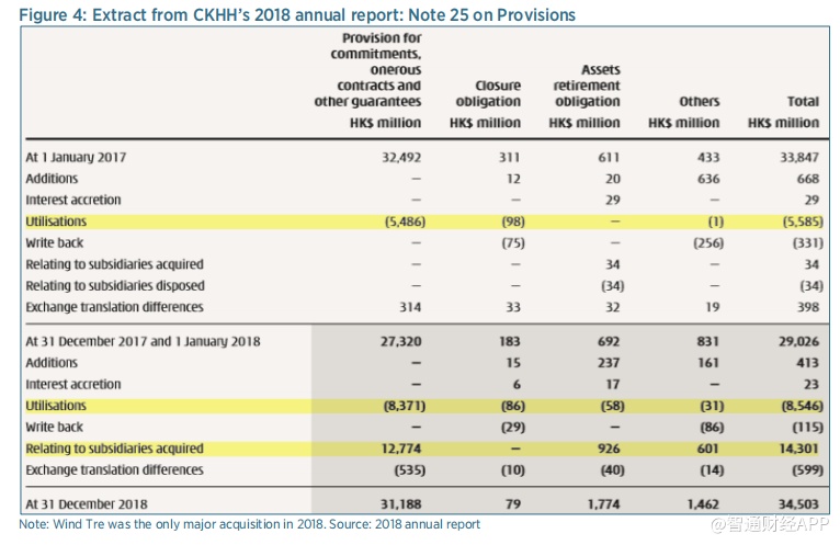 产生的大量商誉增加了收购后利润可能被夸大的风险。事实上,如果我们跟踪一些被收购的负债,我们可以从长和的2018年年度报告(有关准备金的注释25)中看到,在收购Wind Tre时,为“承付款项、亏损合同和其他担保”设立了128亿港元的额外准备金,如图4所示。
