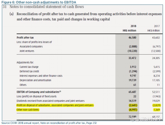 2)处置收益:长和未在综合损益表中提供处置收益的总净额。然而,却在合并现金流量表的附注中加上了26亿港元的处置收益,如图6所示。损益表附注2中所记载的总收益仅为11亿港元,我们并不清楚多出来的15亿收益是从什么地方来的。但单是利润中包含了大量的处置收益意味着,该公司的真实利润并没有财报中所显示的那么多。