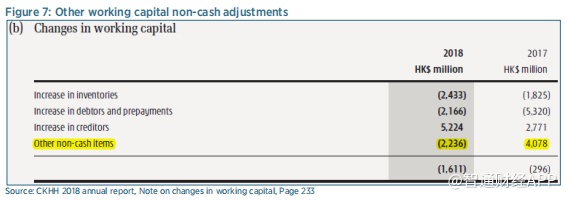 1)非现金项目调整:我们注意到,合并现金流量表附注详述了两个分录。这两个分录的标题为“其他非现金项目”,在2018财年总计约为72亿港元。第一个分录包含在非现金项目票据的对帐中,总计约49亿港元(附录中的图6),第二个分录包含约23亿港元(图7)包含在营运资本变动部分。这些非现金调整项目的性质尚不清楚,然而,它们的影响是使利润增加,而不是增加现金流。