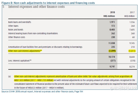 3)其他非现金利息调整:该公司在18财年确认了其15亿港元债务的公允价值调整摊销(见附录中的图8)。这也来源于其在2015年的重组。在重组之时,长和提高了负债,理由可能是因为利息成本的下降以及当时公司的债券交易价高于票面价值。由于债券将按票面价值偿还,因此,在债券的整个生命周期内,减记将作为信贷进行摊销,以获得利润。这种类型的会计调整降低了公司的利息支出,提高了利润。