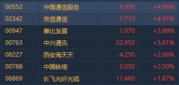 智通财经APP获悉,5G概念股今日集体回暖,止跌回升,截至发稿,中国通信服务(00552)、京信通信(02342)涨超4%,摩比发展(00947)、中兴通讯(00763)涨超3%,中国铁塔(00788)涨2.5%。