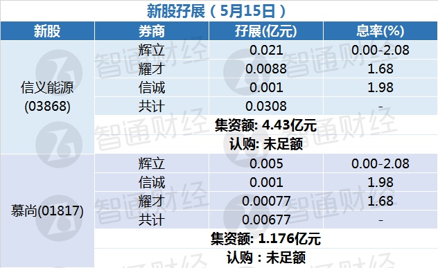 智通财经APP获悉,信义能源(03868)和慕尚(01817)正在招股中,截至5月15日,辉立、耀才以及信诚分别为其借出4.43亿和1.176亿。孖展均未足额。