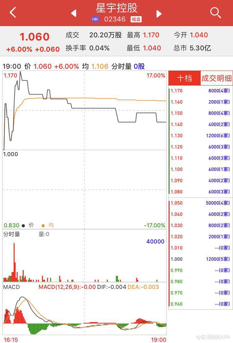 智通财经APP获悉,星宇控股(02346) 将于5月16日挂牌,上市前夕,其暗盘收报1.08港元,较招股价1.00港元,涨8%。每手2000股,不计手续费,每手赚160港元。