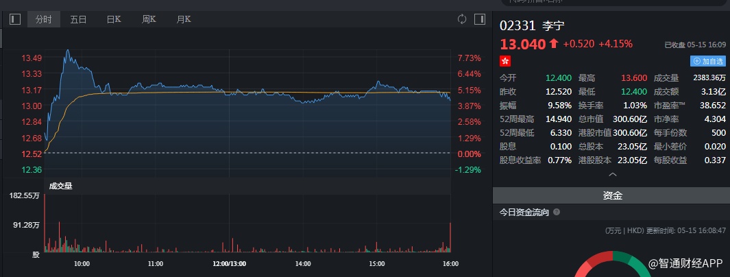 截至今日收盘,李宁(02331)涨4.15%,报13.04港元。