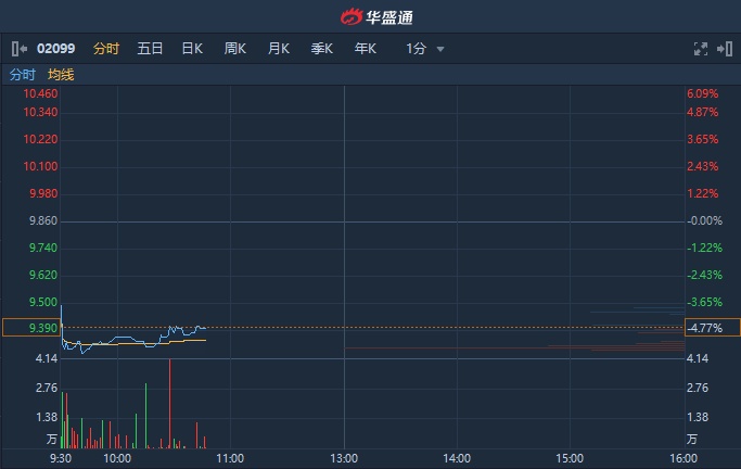 智通财经APP获悉,中国黄金国际(02099)早盘跳空低开低走,截至10时47分,跌4.77%,报9.39港元,成交额达399.5万港元。