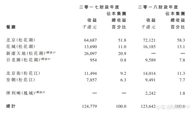 自澳门首间餐厅于2007年开业以来,公司一直扩大在澳门的版图。于最后可行日期,公司在澳门拥有及经营七间餐厅,包括四间以“松花湖水饺”品牌供应东北菜且用餐环境舒适的餐厅;两间以“松花江水饺”品牌供应较经济实惠的东北菜的餐厅;及一间以“凤城小府”品牌供应顺德菜的餐厅。下表为公司按餐厅划分的收益明细: