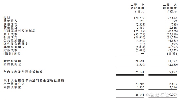 招股书显示,截止2017年及2018年12月31日年度,本集团的收益分别为约1.25亿港元及1.24亿港元;年内溢利及全面收益总额分别为2514.1万港元及909.7万港元。