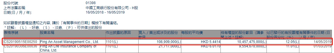 智通财经APP获悉,根据联交所资料显示,平安资产管理于5月14日增持工商银行(01398)1.08亿股,每股作价5.44港元,总值约5.88亿港元,最新持股数目约104.57亿股,最新持股比例为12.05%。