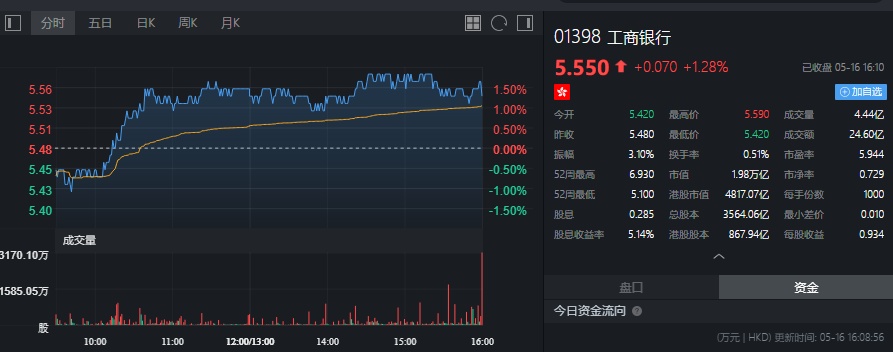 截至今日收盘,工商银行(01398)涨1.28%,报5.55港元。