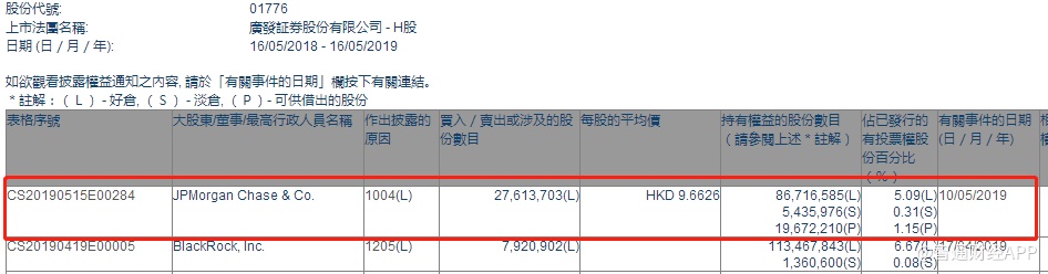 智通财经APP获悉,根据联交所资料显示,摩根大通于5月10日增持广发证券(01776)2761万股,每股作价9.66港元,总值约2.67亿港元,最新持股数目8672万股,最新持股比例为5.09%。