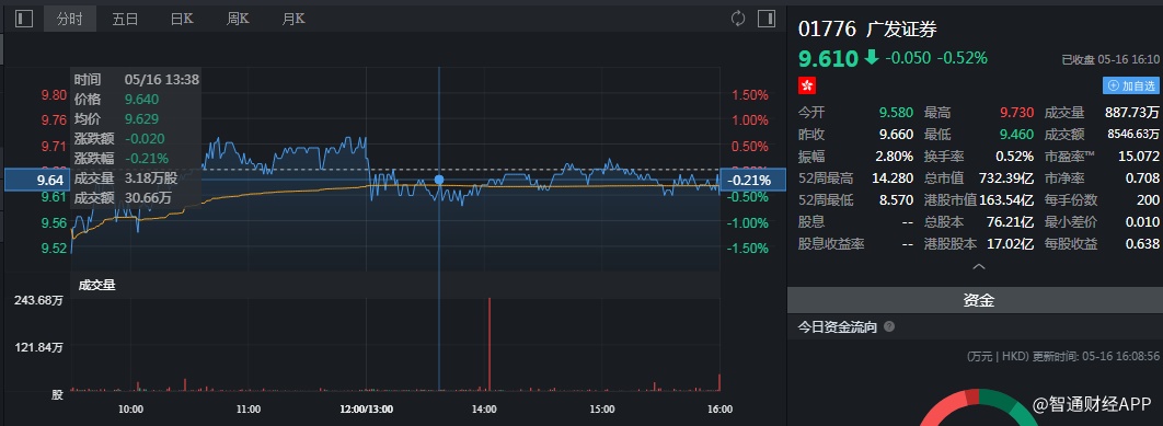 截至今日收盘,广发证券(01776)跌0.52%,报9.61港元。