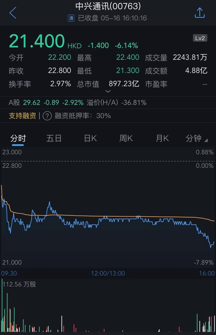 截至今日收盘,中兴通讯(00763)跌6.14%,报21.4港元。