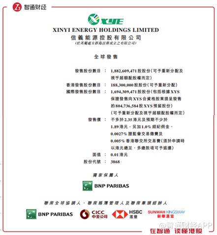 今年3月随着市场回暖,信义能源再次提交上市申请,于5月8日再次喜提上市资格,并且此次还得到两位基石投资者的支持,计划于5月15日-20日招股,拟发售约18.83亿股,其中香港发售1.883亿股,国际发售约16.94亿股;发售价1.89港元-2.35港元;每手2000股,预期2019年5月28日上市。