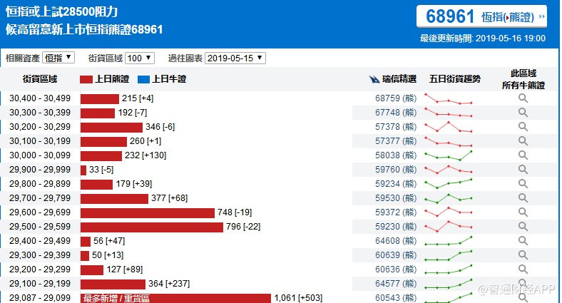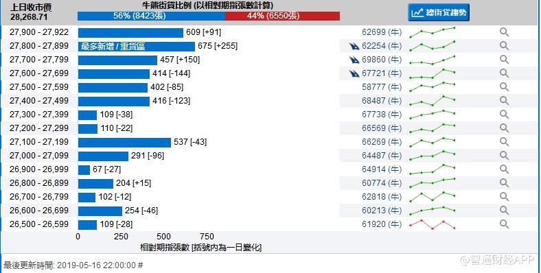 智通财经APP获悉,截至5月16日,恒指最新的牛熊街货比例56:44。从瑞信恒指牛熊证街货分布图中得到的数据显示,熊证街货重货区在29087-29099区间,该区间最新熊证数量为1061张,较上一交易日增加503张,最多新增区间在同一区间。牛证街货重货区在27800-27899区间,该区间最新牛证数量为675张,比上一交易日增加255张,最多新增区间在同一区间。