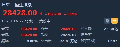 智通财经APP获悉,恒生指数开盘涨152.93点或0.54%,报28428点。国企指数涨0.69%,报10885.85点。红筹指数涨0..63%,报4419.84点。大市盘前成交22.3亿港元。美股连涨三天,道指收涨逾210点。