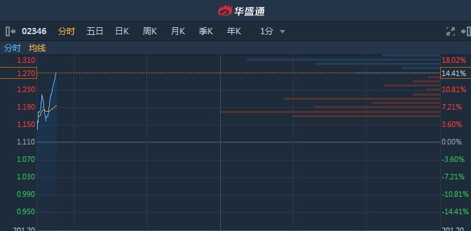 智通财经APP获悉,稀土概念股星宇控股(02346)上市次日,股价再创上市新高,高见1.28港元,较发行价1港元高28%。截至9时45分,涨14.41%,报价1.27港元,成交额1180万。