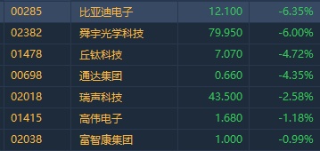 智通财经APP获悉,受外围利空消息影响,手机设备股早盘再度全线下挫,截至发稿,舜宇(02382)跌6%,丘钛科技(01478)跌4.72%,通达集团(00698)跌4.35%,高伟电子(01415)跌1.18%。