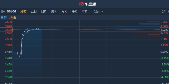 智通财经APP获悉,次新股申万宏源(06806)五连涨,累计涨幅近18%。截至10时34分,涨4.02%,报价3.62港元,成交额1.339亿。