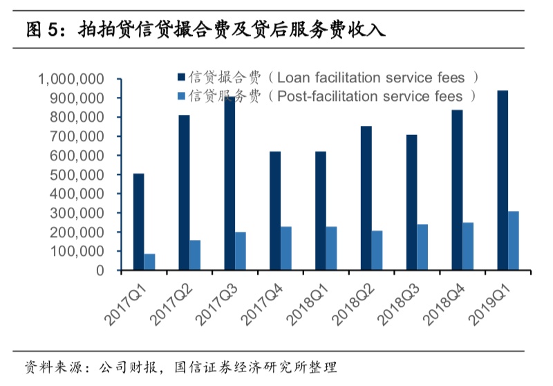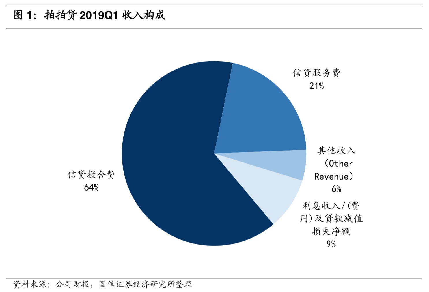 公司目前有两大收入来源:1、来自在线信贷撮合服务费;2、来自信贷撮合后服务费;拍拍贷的主要收入来自在线信贷撮合服务费即交易费用,2019 年 Q1贡献收入 64%;信贷撮合后服务费贡献收入 21%。