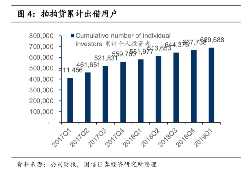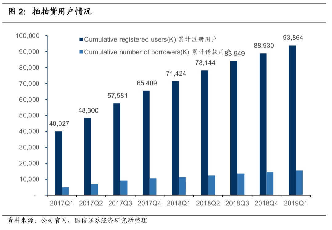 截至 2019 年 3 月 31 日,拍拍贷的注册用户数量达到 9386 万,在贷用户数量达1543 万,出借用户达 689688 人,注册用户向贷款用户和出借用户的转化 率仍有大幅提升空间,带动业绩增长可能性大。