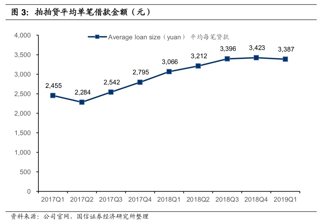 拍拍贷 2016 第四季度至 2018 第四季度,拍拍贷平均单笔借款金额不断提升,2018 年第四季度达 3423 元,2019 一季度 3387 元。截至 2016 年 9 月末,中 国消费金融公司的平均单笔贷款金额 0.86 万元。于拍拍贷而言,单笔借款有大 幅提升空间,进一步驱动业绩增长。