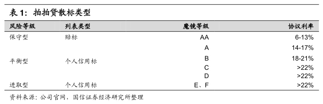 拍拍贷平台上,散标首次借款金额为 500-30000 元间。按时还款累计信用后, 用户额度会有较大幅度提升。个人借款额度最高可达 20 万元,借款期限最长为24 个月,协议利率由 6%至大于 22%不等。基于大数据模型,魔镜针对每一笔 借款标的进行风险评级,评级区间为 AA 到 F,风险依次上升并向出借者和借款 者展示,并进行风险定价,风险越高,协议利率也越高,来保证收益和风险相 匹配。
