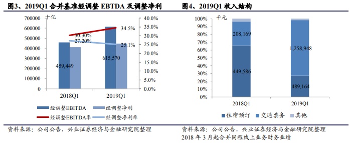 微信社交属性挖掘流量承销显著,一季度平均月活增长高企。2019Q1 同程艺龙合并平均月活近2 亿,相比去年同期增长22.0%。其中腾讯平台月活1.7 亿,季度内增长23.1%,占公司总月活的 87%,相对 2018 年占比上升6.7%。来自于微信支付和微信下拉菜单入口的月活1.05 亿,占腾讯平台月活数60.8%,一季度增长41.8%。微信分享搜索贡献月活3510 万左右,占腾讯平台月活数 18.90%,一季度增长89.6%。腾讯平台互动广告贡献月活3280 万,占腾讯平台月活数20.30%,一季度减少28.5%。从数据上来看,微信平台依旧是同程艺龙月活增长主力。同时可以看到借力于微信社交属性的流量挖掘作用力在增大,微信分享搜索的贡献度在提升,相比2018 年,Q1 分享搜索月活增长,远高于腾讯平台互动广告入口和微信支付及下拉菜单入口。