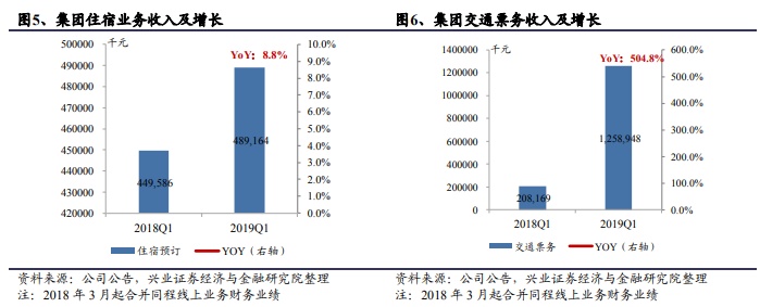 出行旺季,交通票务服务业务成主力。2019Q1 公司交通票务服务业务收入12.6 亿元,同比增长504.8%,机票业务收入和地面交通业务收入五五开。目前来看,公司交通票务业务收入占比依然在提升,贡献70.6%的收入水平,同比上升40.1%。一方面来自于合并同程线上业务的财务业绩,另一方面来自于第一季度春节假期的出行旺季的带动,地面交通增长势头强劲。