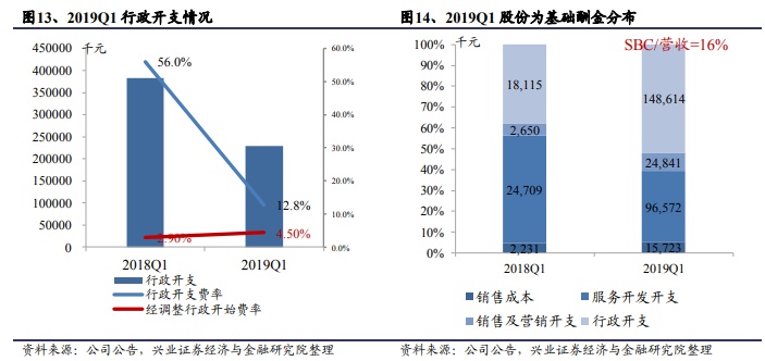 2019Q1 三费费率整体水平有所下降,但股份为基础的酬金支出对三费费率影响较大。一季度股份为基础的酬金总体支出较大达到2.9 亿,占收入比由去年同期7%上升到16%。其中52.2%分布于行政开支,33.8%分布于服务开发开支,8.7% 分布于销售及营销开支。一季度公司服务开发开支费率33.5%,下降5.3%,销售及营销开支费率26.3%下降9.2%,行政开支费率12.8%下降43.2%。剔除股份为基础的酬金影响,三费费率分别为18.7%/24.9%/4.5%,服务开发开支费率下降5.4%,销售及营销开支费率基本持平,行政开支略上升1.6%。从整体来看,三费费率整体下降趋势,Q1 国际准则下三费总费率为72.6%,同比下降57.6%,经调整总费率48.1%,同比下降4%。