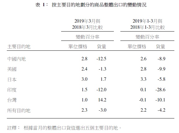 2019年3月与2018年3月比较,商品整体出口价格上升2.3%。同时,商品进口价格亦上升2.3%。2019年与2018年同期比较,商品整体出口价格上升2.2%。同时,商品进口价格亦上升2.2%。(对外商品贸易的价格变动是以对外商品贸易的单位价格指数变动反映。这指数是根据平均单位价值或个别商品的实际价格来计算。)与2018年同期比较,这指数在2019年3月上升0.1%,而在2019年首季则大致维持不变。