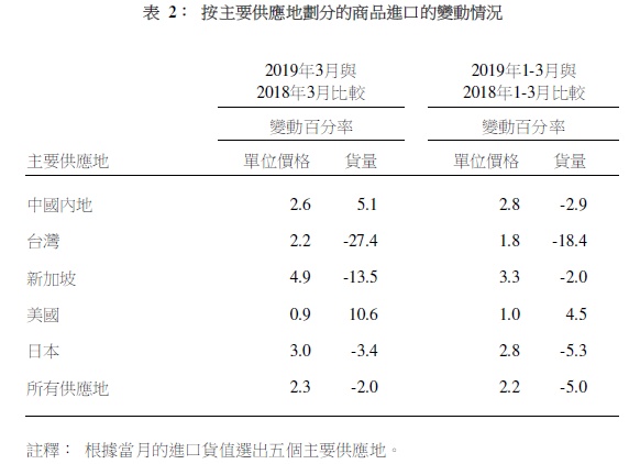 2019年3月与2018年3月比较,来自新加坡的进口货量取得13.5%的双位数字跌幅。同时,来自日本的进口货量下跌3.4%。另一方面,来自内地及美国的进口货量则分别上升5.1%及10.6%。与此同时,来自所有主要供应地的进口价格均上升:新加坡升4.9%、日本升3.0%、内地升2.6%及美国升0.9%。
