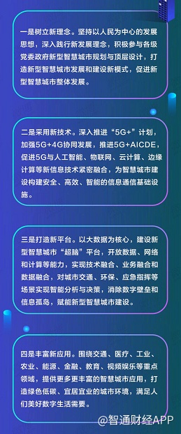 其中包括:深入推进“5G+”计划,加强5G+4G协同发展,推进5G+AICDE,促进5G与人工智能、物联网、云计算、边缘计算等新信息技术紧密融合,为智慧城市建设构建安全、高效、智能的信息通信基础设施。
