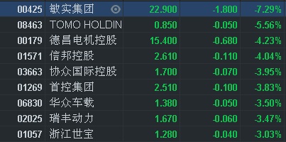 智通财经APP获悉,汽车零件板块今日表现低迷,截至发稿,敏实集团(00425)跌7.29%,德昌电机控股(00179)跌4.23%,首控集团(01269)跌3.83%。